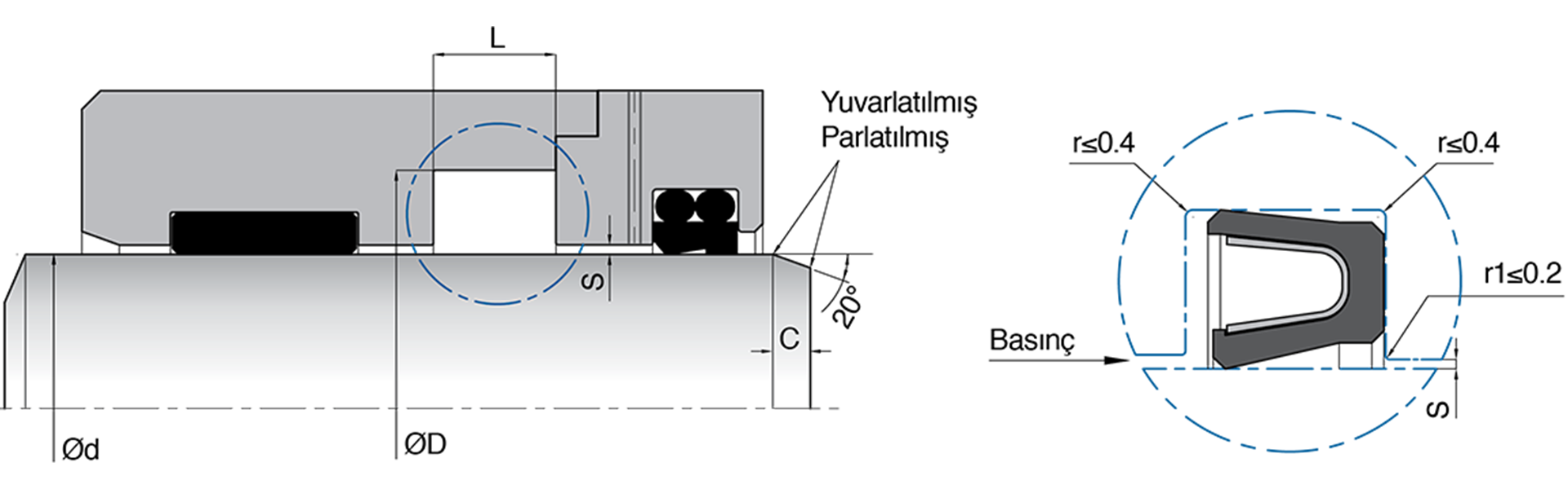 K701 PTFE sızdırmazlık nutringi ve «V» şeklinde itici paslanmaz yaydan oluşan tek etkili boğaz sızdırmazlık elemanıdır.