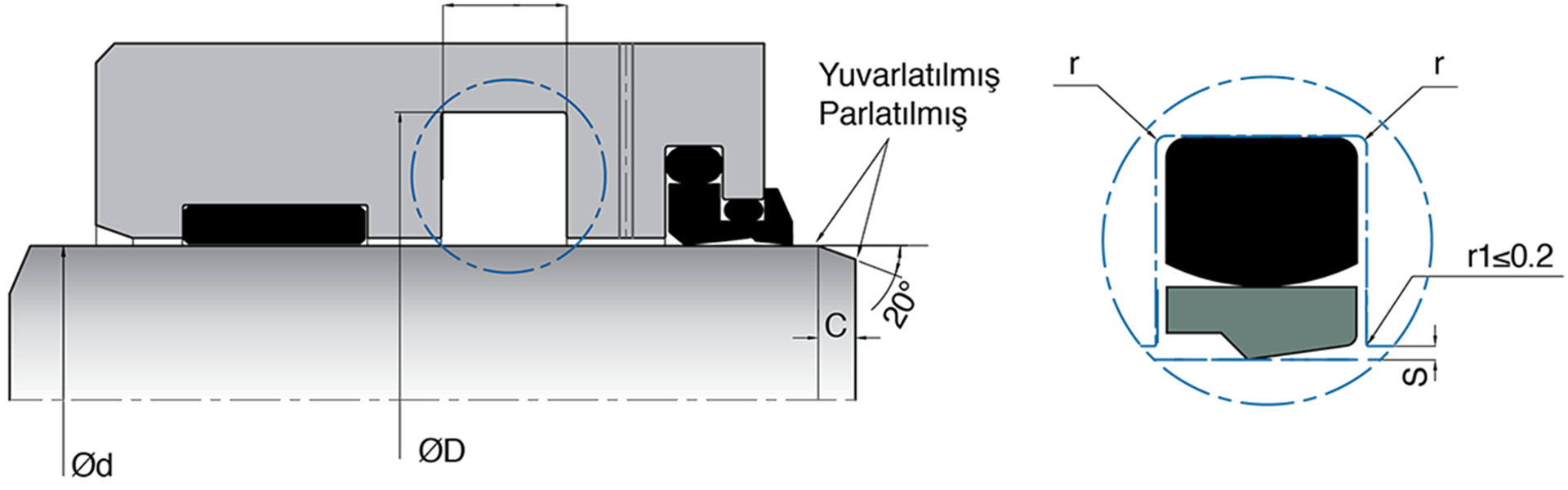 K704 açılı geometriye sahip PTFE sızdırmazlık ringi ile itici görevi yapan dikdörtgen profilli elastomer ring parçalardan oluşan tek etkili boğaz sızdırmazlık elemanıdır.